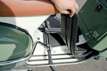 Aki még nem vezetett öreg Vespát, annak kezdjük a leglényegesebbel: ezek nem automaták. A bal kormánymarkolattól és a vele forgó-egységbe foglalt kuplungkartól bowden vezet a váltóig. Egy fokozat előre, üres, majd három hátra a kiosztás. Egyszerű, mint a pofon, bár tény, hogy a csak-a-gázt-húzom-és-megyek CVT-nél egy fokkal több tudományos előképzettséget kíván.