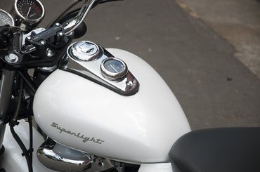 Persze, az első villák vékonyak, akár a fűzfák dereka a nagyi kertje előtt, a hátsó lámpa formája és elhelyezése, a szalámiszeletelő kipufogók inkább a japán iskolára hajaznak. Ráadásul az a két bazi dob egy szívószálként indul a hengerből, s a régi olasz motorok stílusában később oszlik ketté. A név pedig végképp vicces, hiszen ebben a cruiseres közegben nem a könnyedségre szokás büszke lenni, hanem épp ellenkezőleg, itt súlyos egyéniség a tulaj, s hozzá illően heavyweight a motorja is. Például Fat Boy, jut eszembe. Erre ez meg Superlight, amerikai, ötvenes évekbeli diner-eken használt betűkből kirakva a tankon... Lol.