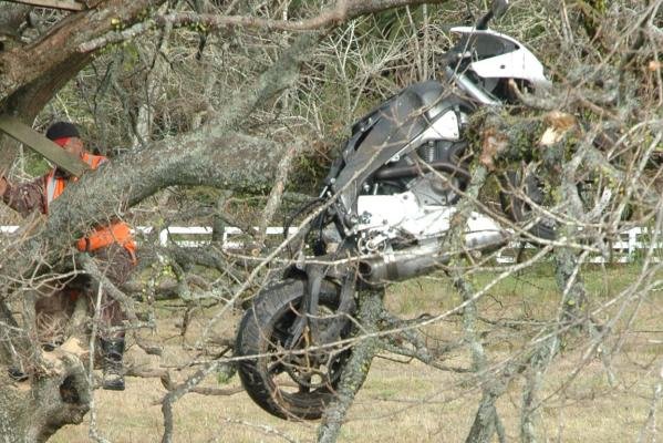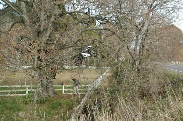 Fészket ugyan nem rakott, de fán landolt a motoros. Az új-zélandi Buell gazdája gyorshajtás miatt nem tudta befejezni a manővert – szerencsétlenségére messzire katapultált. A rendőrségi híradás szerint súlyos sérüléseket szerzett; nem ússza meg a hosszú kórházi kezelést.