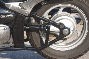 A Suzuki egyébként szépen oldotta meg a merevnek látszó hátsó villát, ami a látványhoz képest rugózik, sőt, a rugó előfeszítése még állítható is (7 fokozatban), de olyan mélyen van eldugva, hogy ez nem feltétlenül a legegyszerűbb művelet. Az első villa nem állítható, viszont fordított, ami meglepett. Azonban az Intruder rugóútjainak a magyar utak így is feladják a leckét, hiába na, a cruiserek ilyenek. A fékek a műfajon belül – de csakis itt – elfogadhatónak mondhatók. Én speciel a Honda VT750 S hátsó dobféke után semmi jóra nem számítottam, ehhez képest a Suzukié szinte fog. Az első tárcsával sincs nagy baj, úgy sem pályanapozni vesz az az ember M800-ast – plusz pont, hogy a fékkar is állítható. Az Intruder dönthetősége is elviselhető, persze nem különösebben nagy stunt-mutatvány megszikráztatni az oldaltámaszt, de normál kanyargásban ez még nem gond, amúgy pedig kellemesen kezes a középsúlyú japán cirkáló.