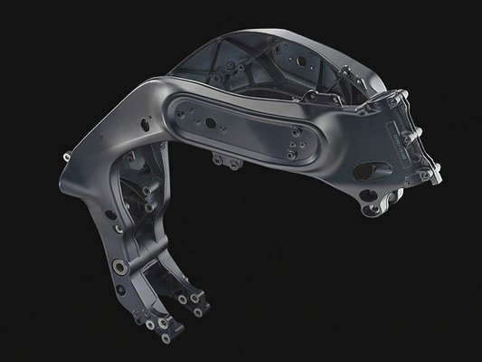 A hátsó rugóstag horizontálisan helyezkedik el, sőt, a lengővillától a váz felé még lefelé áll. Az eredeti koncepciómotor még különlegesebb volt, ott ugyanis a motorblokk bal oldalán futott volna a rugóstag, a lengővilla és a blokk elejére csavarozott segédkeret között. Ezt végül elvetették, de az egyhengeres, filigrán kistesó, az MT-03 szériában hasonló megoldást kapott. Én ezt nem bánom, talán túlzás lett volna.