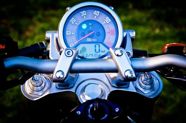 Itt ülök rajta. A műszerfal egyszerű, hatalmas kerek óra mutatja a fordulatszámot. A műszeregység nem bután nagy, de ahhoz elég, hogy uralja a látványt. A kilométeróra digitális, ezt utálom, biztosan konzervatív vagyok – különösen ezen a motoron nem csípem. Az egész egység ezüst színű, fényezett műanyagnak – azaz kissé gagyinak – néz ki. Valójában fém: úgy néz ki, megtanultak műanyagnak látszó fémet gyártani.