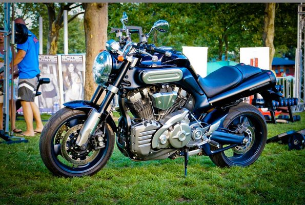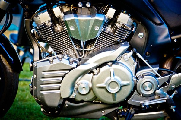Jól látható, hogy a motor azért ilyen „cseppet sem lapos”, mert a nagy V2-es nem fér be máshogy a vázba, hiszem nem lenne jó, ha karcolná az aszfaltot. A tank oldalán levő fémhasáb levegőbeömlőket takar. Sokakat emlékeztet ez a V-Max-ra, pedig annak kamu kopoltyúja volt csupán – végül mégsem az MT-01 lett a V-Max utód, hiába hittük, amikor '99-ben a koncepciómotor megjelent. Talán mert nem volt elég erős?