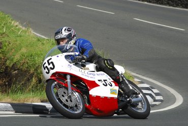 A következő versenynap hétfő, mire elindulunk, már lezárják a pályát, de egy kis hegyi úton feljutunk a Ramsey fölött a Gooseneck-hez. A 250/350 Classic kategóriában kedvencem Geoff Bates, akivel a depóban ismerkedtem meg. Két Hondát hozott át a szigetre, egy 350-est és egy 750-est, vagyis ugyanolyanokat, amik nekem is vannak otthon – innen a közös téma. Nem hiába drukkolok, 3. lesz a Classic Lightweight kategóriában.