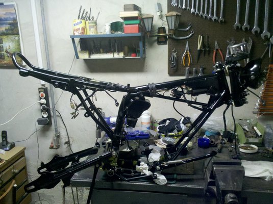 De mikor ráültem egyből szépiában láttam a világot... Ejj akkor még minden jobb volt, vágnám rá, de nem! Az ergonómia teljes hiánya! A klasszikus Magilla Gorilla biciklizik póz. A műszerek nem a vezető felé fordulva, hanem az eget kémlelik, hogy ha pár csepp eső lehull mindenképp megálljon benne a víz és ki kelljen törölni az addig még száraz kesztyűvel. Az irányjelző kapcsoló nem old ha középen megnyomjuk, sőt kombináltfogó nélkül meglehetősen nehéz használni. Az első gumi 21 colos vágott slick, a hátsó két-három mérettel nagyobb krossz gumi. A két (igen jól hallotta mindenki, kettő darab) hátsó rugóstag nemhogy visszajelzést nem ad a hosszú elnyújtott jobb kanyarban, hanem egy rozzant görgőslábú irodaszék is jobb úttartást ad. És így tovább... Na szóval megtetszett a gép. Fontos, hogy semmiképp ne kezdj ilyen felújításba ha van: Feleség, barátnő, havercsaj, meleg élettárs... Sanszos hogy hamarabb kettesben maradsz a motorral mint hinnéd.