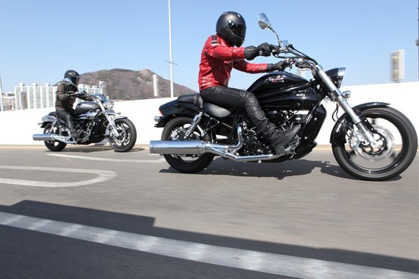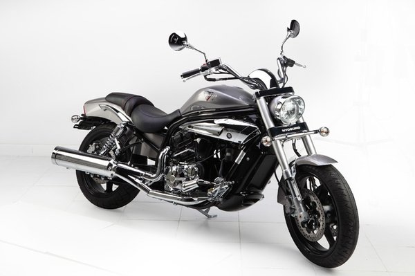Mondhatnánk rá, hogy a Harley V-Rod koreai kistestvére, de van benne annyi sajátos ázsiai íz, hogy azonnal felismerhetővé válik a V2-es. A tank alatti krómozott panel rögtön elárulja, melyik gépről van szó – aki furcsán modern és közepesen aránytalan motort szeretne, nyissa nagyra szemét.