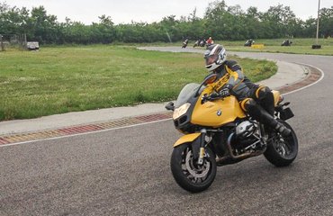 A legjobb azonban csak ez után következett, a bátorságpróba. Már a feladat is elég ijesztően hangzott: a célegyenes végén elfordulni, nagy tempónál, fékezés nélkül. „Akkor jó, ha az jár a fejedben, hogy húbazeg, ez már sok lesz” - összegezte Totti, az instruktor a lényeget. Kiderült, hogy egész hihetetlen tempóról is be lehet fordítani a motort: be kell nézni az ívre, kormánytolással le kell dönteni a gépet, és imádkozni. Mondjuk ez utóbbi nélkül is megtörténik a csoda, a kanyarodás annyit lassít a motoron, hogy a közepén már gázt kell húzni, ha nem akarunk eldőlni. Itt olyan 80-90 km/h körüli induló sebességekről lehetett szó, bár pontosan nem tudnám megmondani, én ugyanis minden motoros tréningek első számú szabályához tartottam magam: mindig oda nézz, ahová menni akarsz.