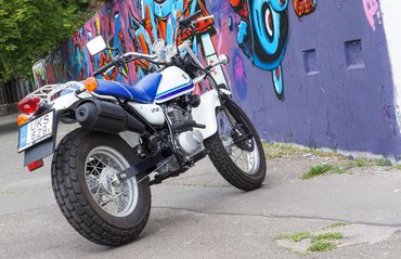 Nem tudtuk előre, hogy a tesztmotor milyen színű lesz: mivel én egy sárgát látok nap mint nap a budai alsó rakparton szembejönni, erre számítottam, de amikor megláttam a konkrét példányt a Motorrad szalonjában, leesett az állam. Pedig nem kellett sok, hogy igazán látványossá tegyék a gépet, csak visszafogott kék-zöld csíkozás a tankra, egyszerű fehér alapszín és egy, a csíkozáshoz illő kék nyereg.