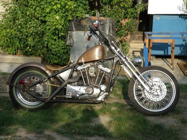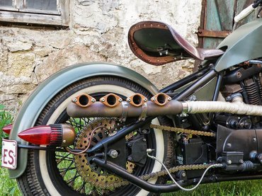 A Harley tulajdonosa szeretett volna ilyet; az ősrégi amerikai épített gépeken lehetett hasonlókat látni; akkor tréfás kedvű suhancok tettek fel vasdarabokat, melyek előtte ősi nyolchengeres autók leömlői voltak. Idehaza ilyenekből aránylag kevés van, így Szakál legyártotta rozsdamentes acélból, akárcsak a hozzá vezető könyököket. A négy lyuk szélére rézkupak került. Elegáns.