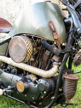 A tankon mindenkinek megakad a szeme, nem csoda, ilyet még sehol nem láttunk. Egyedi Art Deco termék, kézzel készült, speciálisan erre az acélvázra. A leszorításról rézzel antikolt csatok gondoskodnak, ezek Szakál szokásához híven régi síbakancsról származnak. Az egyedi légszűrőház is idehaza született – ezt speciális igények alapján készíti az Art Deco Motorcycling.