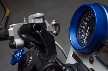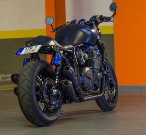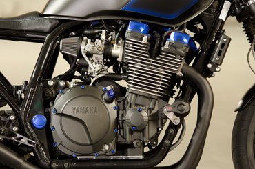A kék kiegészítők arra utalnak, hogy a versenysportban a Yamaha kék, így kékes lett a fényezés, egy csomó csavar a kerekektől a féknyergekig, és még a hátsó, arany Öhlins tartályokat is kékre cserélték. Az eredeti XJR képét meghatározó króm palacsintasütő-lámpa helyére egy kisebb, matt fekete került. Sokk matt fekete kis kék fűszerezéssel – hatásos, visszafogott, ízlésesen gonosz. Az eredeti kapcsolók mentek a kukába, így sajnos az elakadásjelző is, ami praktikus dolog, ha az ember meg akarja köszönni egy-egy autós előzékenységét. Fekete minimálkapcsolók kerültek a kormányra piktogramok nélkül, fejben kell tehát tartanunk, hogy jobb oldalt a közelebbi a duda, a távolabbi az indítógomb, balról meg az egyik a fénykürt, a másik a reflektor. Az index és a RUN/OFF gomb egy-egy billenőkapcsoló lett, ezeket is könnyű megszokni.