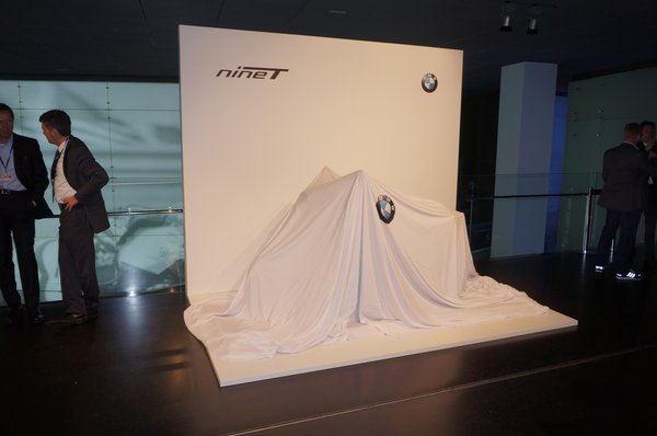 A NineT-t persze nagy születésnapi meglepetésnek szánták, és véletlenül sem szerették volna, ha idő előtt meglátjuk a leplezetlen gépet: a sajtótájékoztató megkezdése előtt kínosan ügyeltek arra, hogy az újságírókat távol tudják tartani. Miután kellően felcsigázták az érdeklődést, kaptunk egy rövid történeti áttekintést a BMW Motorrad kilencvenéves történetéről. Peter Schwarzenbauer, a cég vezetőségének tagja emlékeztetett arra, hogy a márka korábban kezdett motorkerékpárok gyártásával foglalkozni, mint autókkal. Múzeumukban jelenleg több mint 140 modellt őriznek.