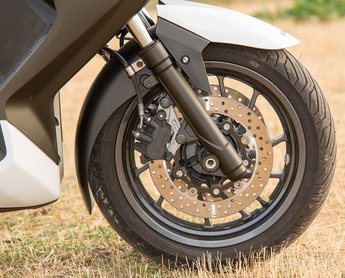 Elöl dupla tárcsa, sokáig azt hittem, ABS-szel, csak a teszt végén kísérleteztem ki, hogy ha agyatlanul berántom a hátsót, akkor csúszni kezd. Tehát mégsem ABS-es, viszont iszonyúan hatékony és jól adagolgató, ezért is venni észre nehezen a blokkolásgátló hiányát. Ettől függetlenül ekkora robogót csak ABS-szel vennék, és mást is erre biztatok. Mégiscsak 211 kiló, és bár hőségriadóban teszteltem, egy ilyen motort simán használ az ember még október közepén is. A féktárcsák átmérője egyébként elöl-hátul 267 milliméter, csak hátul feleannyi tárcsa és dugattyú van.