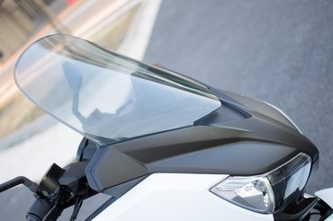 Szélvédőből háromféle választható az Xmax 400-hoz, a tesztmotor pont azzal jött, amit a legkevésbé szeretek. Van ugye a kicsi, alig észrevehető plexi, ami kicsit letolja a felsőtestünkről a szelet. Az a kedvencem. A másik véglet a nagy tolólap, ami legalább a homlokunkig ér. Ezt ajánlom nagy szeretettel mindenkinek, aki kényesebb ruhában robogózna. Ez az átmeneti az, ami szerintem semmire sem jó. Pont a bukósisak alsó részére nyomja a szelet, ha tehát valaki a robogón elég elterjedt félarc-maszkos bukósisakot használ, játszhat azzal, hogy Jar Jar Binks-szájat csinál magának már 80 km/h-nál, miközben a turbulencia úgy feldagasztja rajta az inget, mint Pierre Richard-on a méhek A balfácán című filmben.