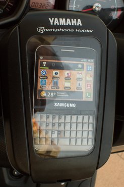 A másik, hogy a Yamaha, illetve az olasz cég, aki a Yamaha kiegészítőit fejleszti, feltalálta a Naprendszer első vízhatlan okostelefon-tartóját. Jó, mi? Most nem mondom meg, hányas imbuszkulcs kell, ha el akarunk lopni egy ilyet, csak hogy tényleg átgondolt holmi, több, mint egy átlátszó fedelű, kemény műanyag doboz. Három szintes, alapban micro USB-s telefonokhoz való, de iphone-osok is rádughatják a maguk kábelét. Így aztán navigálhatunk, és nem merül le a telefon, de egy bluetooth-os fülhallgatóval telefonálhatunk is, illetve látjuk, ki az, akit felveszünk.