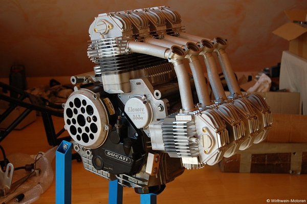 A német Dieter Hartmann-Wirthwein neve sokak számára már ismerős lehet. Tudják, ő az, aki néhány évvel ezelőtt odahaza kezdett bele egy V8-as építésébe, melyhez kiindulási alapként egy 868 köbcentis Ducati-blokkot választott. Az első hírek még arról szóltak, hogy a gyári főtengelyt menti át a meglepő konstrukcióhoz, végül azonban új főtengely készítése mellett döntött.