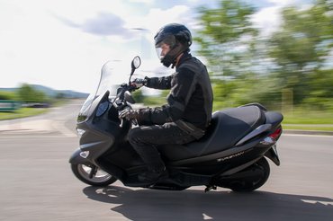 A blokk négyszelepes, alapjáraton rezonál tőle az egész műanyagtenger, de amikor összezár a CVT-váltó, kisimul a járása, és valahol ötezer fölött, ahol egyébként menni kezd a Burgman, már szinte semmi jel nem utal arra, hogy egy valódi motor jár a fenekünk alatt. A fordulatszámmérő még egy dologra jó, megfigyelhetjük rajta, hogy minden ugyanabban a háromezer fordulatnyi tartományban történik, tehát nem lehet vele kíméletesen, vagy különös kegyetlenséggel közlekedni.