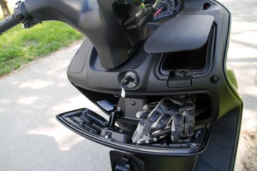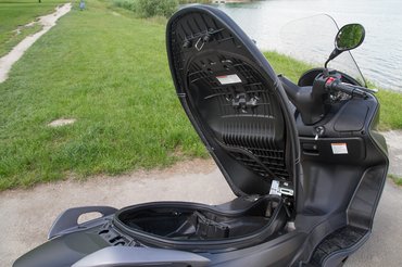 Azt sem gondolom, hogy a gyengébb, de nem sokkal olcsóbb Burgman 125 érzékelhetően kevesebb benzint kérne, azt tényleg csak azért érdemes számításban venni, mert a nagyobbik verzióhoz nem elég a B125-ös jogosítvány. A Burgman 200 tizennyolc lóerős, és ezt érzésre tudja is, hiszen hetvenről százig nagyon szépen gyorsul, és száztíz fölött van a végsebessége. Az ülés hátul ormótlan, tehát a rövidlábúságban szenvedő utasnak lesznek gondjai a kényelemmel, viszont a sok szivacs alatt akkora üreget találunk, melyben valóban elfér két zárt bukósisak, vagy 41 liternyi bármi más, ráadásul van világítás is.