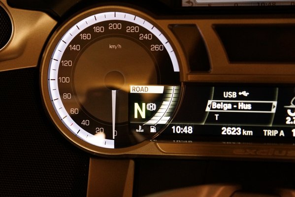 A K 1600 GTL Exclusive-en van pár új fícsör. Ilyen a már említett fényezés, a kulcs nélküli rendszer, a fűthető háttámla, aztán van még LED-es nappali menetfény, krómozott biszbaszok, meg egy autókból már ismerős extra, a lejtőn való visszagurulást meggátló, elindulást segítő Hill Start Controll. Csak meg kell húzni egyszer, erősen az első féket, és addig fogja a rendszer a motort, míg még egyszer meg nem húzzuk a fékkart, vagy meg nem próbálunk elindulni. Új még a műszerfal is, új funkciókat tettek rá és a megjelenése is változott. Ami azt illeti, ezt a dizájnt már az RT-n sem szerettem, mert bármennyire is mutatós, este kimondottan zavaró, hogy a műszerfal legfényesebb része a két nagy, fehéren világító karika, ezek elnyomják a számok és a mutatók fényét. Zavaróak az LCD-panel fekete alapon fehér karakterei is, tipográfiai alapvetés, hogy a fehér alapon feketével megjelenített szöveg könnyebben, gyorsabban értelmezhető. Márpedig információból van bőséggel.