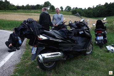 Az Ennstal Classicra szervezett túra gyakorlatilag végig tökéletes volt, még az eső sem tudta elrontani az élményt. A négy nap alatt nagyon összeszoktam a Burgman Bázistól kapott 400-as Burgmannel, nem is szívesen cseréltem mással motort, pedig a 350-es Beverly sportosabb, a kis PCX még ha lassabb is, de kezesebb volt. Csak ugye egyrészt a megszokás, másrészt a Burgmanen tényleg nem áztam (annyira nem, hogy én sem akartam elhinni), kényelmesen ültem, az összes cuccomat elnyelte, és az erejére sem panaszkodhattam. Már azt tervezgettem, hogy ha hazaérek, alaposan lemosdatom, kipróbálom rajta a Motul-kencéket, mert volt pár kisebb karist a fekete fényezésen, meg a műanyagokon és a nyergen is leteszteltem volna a speciális anyagokat. Hát, ahogy elnézem, ide most kevés lesz a karceltávolító, hogyrohaggyonmeg.