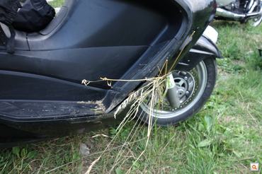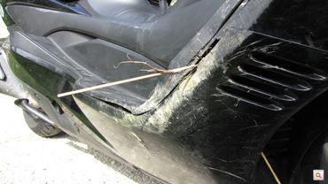 Sajnos, akárhogy is próbálom szépíteni a dolgot, ezt bizony én basztam el, maximum enyhítő körülmények vannak, de legfőképpen tanulságok. Sajnos tudomásul kell venni, hogy egy robogón, akármekkora testű is, nincs felhajló lábtartó, ami időben figyelmeztetne, hogy nemsokára leér a motor a kanyarban. Nem mint ha szükség lett volna rá, tényleg nem akartam én minden íven szikráztatni a sztendert, ésszel kanyarogtam, akar a fene meghalni. Egyetlen egyszer, egy elnyújtott jobbosban éreztem, még a legelső napon, hogy egy pillanatra leért a középállvány, és ennyi figyelmeztetés nekem bőven elég volt, hogy ne kísértsem az Úristent. A baj az volt, hogy nincs elég tapasztalatom az ilyen nagyon szűk, nagyon meredek szerpentinekkel, és hiába ültem már napok óta robogón, nem tudatosult bennem, hogy a lábdeszkán jóval fentebb van a lábam, mint a sztender, és ez elég becsapós.