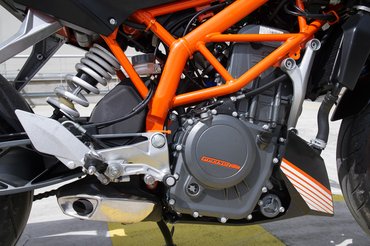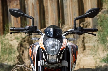 Persze, én is szilárdan vallom, hogy erőből sosincs elég. A 390-esnél nem is panaszkodhatunk gyengeségre, elképesztő, amit ez a blokk tud. Méretes egyhengereshez méltóan két-háromezres fordulattól szépen elkezd dolgozni, de fent, ahol műfajtársai elkezdenek fulladni, ő kinyílik. Gondolom, azért is kezd el nyolcezernél villogni a váltásjelző, mert olyan elszántsággal forog bele a tízezerbe, hogy amíg meg nem szokjuk, sokszor beleütközünk a fordulatszám-korlátozó falába.
