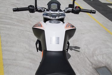 A narancssárga már örökké a KTM színe marad, olyan lett, mint a Kawasaki-zöld. Ezen a fehérnek nevezett motoron is igazából több a narancs: nem csak a váz (és a ráreccsentett gyorskötözők) meg a dekorok, de a radiális küllőket mímelő kerekek is élesen rikítanak – nem a tömegben elvegyülni vágyók motorja ez. Szemből egyértelműen Grievous tábornok állt modellt a maszk formatervéhez, mégsem menekülnek előle a megfélemlített autósok.