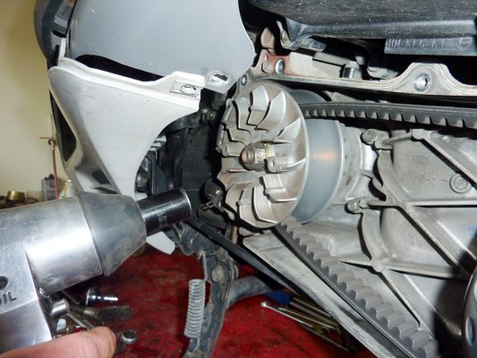 A kuplungtengelyen található kúptárcsák alaphelyzetben közel helyezkednek el egymáshoz képest, ezért a körülbelül két- két és fél centiméter szélleségű szíj ezen szakasza nem tud a tengely felé mozdulni. A kuplung belsejében szintén a fordulatszámmal arányos módon történnek a dolgok. A fordulatszám növekedésével megfeszül a szíj, majd a két kúpos tárcsát pozícióban tartó nagyrugó, más néven kontrasztrugó nem tud ellenállni a feszítésnek. A szíj sem tud megnyúlni, ezért miközben sebessége nő, fokozatosan leküzdi a rugó ellenfeszítő erejét, és végül a szíjtárcsák közé jut, a legmélyebb pont, tehát a legkisebb átmérő felé. Így változik meg menet közben a főtengelyen és a kuplungoldalon is az áttétel, de ebből mi csak annyit érzékelünk, hogy a robogó lassan elindul, majd először intezníven, később enyhébben, majd végállapotban szinte egyáltalán nem nő tovább a motor fordulatszáma.