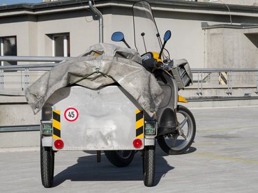 Amikor Gergő, a tulajdonosa elhozta, elég ijesztően nézett ki: elöl-hátul nyitott tálca, rajtuk ez a gyűrött, szürke vízálló burkolat, és egy szép nagy utánfutó. Kiderült, hogy ez nem is valami házi átépítés, gyárilag ilyen: a Piaggio így szállítja a postások számára. Naná, éves szinten tízezres tétel lehet, így nyilván megéri átállítani egy gyártósort.