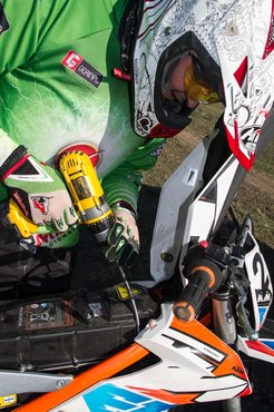 ...és ezt nem én mondom, hanem Gerendás Szabolcs, a motor tulajdonosa. Ő ugyanis komolyan gondolta, hogy egy dedikáltan hobbijárművel indul a célzott versenytechnika ellen – ha már rá van írva, hogy racing. A KTM erre annyira nem készült, hogy még az oldalsó rajtszámnak sem igazán hagytak helyet. Ennél viszont nagyobb gondot jelentett, hogy a futóművet 60-70 kilós motorosra lőtték be, ami az ő 95 kilójához és vezetési stílusához olyan, mintha nem is lett volna. Két út állt előtte: vagy vesz egy komplett futóművet az Öhlinstől vagy a WP-től, 1-1,5 millió forintért, vagy a meglévőt igazíttatja magához, nagyjából annak ötödéért. Az utóbbi mellett döntött, rugót cseréltek, szelepeltek, beállítottak.