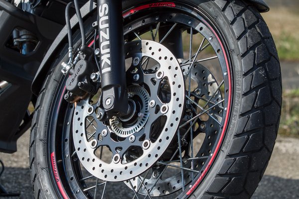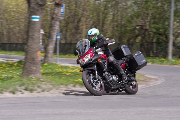 A futómű ügyes kompromisszum, nem követték el a hibát, hogy túl sportosra vegyék csak azért, hogy kisebbet bólintson fékezésnél. Cserébe egészen elviselhetővé teszi a kisebb és közepes úthibákat. A nagyobbakkal már nem igazán tud mit kezdeni, de arról nem a Suzuki tehet, hogy egy-egy alacsonyabb rendű útra sportendurót ír fel az orvos. A hátsó gátló rugóelőfeszítése egy kerékkel állítható, az elsőhöz viszont szerszám kell – igaz, annak hangolására sokkal ritkábban érez kényszert a hétköznapi motoros. Az alapbeállítás 80 kiló körüli vezetőhöz pont jó, lényegesen sportosabban lehet csapatni annál, amit a magyar rendőrök még elnéznek. Fotózás kedvéért egy kis földutazásra is rápróbáltam, és még a rumplikat is elég jól kisimította, nem hozta rám a frászt aggasztó elpattogásokkal. A nagy tömeg és a 19-17-es kerékméretek miatt nem lesz egy offroad-legenda, de a burkolat nélküli csapásokat azért elég jó tempóval lehet teljesíteni.