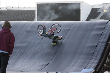 Aztán élesben vagy sikerül, vagy nem – a motoros trükkök azért simán mentek, de például ott volt, amikor jött a gyerekkrossz motorral beadott hátraszaltó, és míg a roadok rendezték a nagy érkezős szivacsot, a srác azért megpróbálta mellettük, és nem jött össze. Az rámpa aljában aztán felpattant, nekifutott még egyszer, és másodjára tökéletesen landolt.