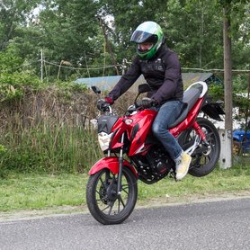 A váz a régi idők szellemében acélcsőből hegesztett bölcsőváz, ami már vaskosan törióra, aztán ott van a blokk, amit már a krétakor szárnyas gyíkjai is ismerhettek. Ennél egyszerűbb szerkezetet nem is nagyon tudok mondani: egy henger, egy vezérműtengely, két szelep, léghűtés. Nincs is túlfeszítve, 10,6 lóerőt és 10,2 Nm tud, vagyis nagy vonalakban sem használja ki az A1-es jogosítványkategória lehetőségeit. Mondjuk nem is romlik el soha, utánakérdeztem néhány szerelőnél, akik szerint ez még akkor is menni fog, amikor már lehet karácsonykor tévézni Reszkessetek betörők nélkül.