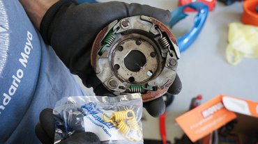 A szakértők szerint sincs bevett recept, az alkatrészek csereberéjével és próbálgatásával lehet előre haladni. Nekünk pedig a Polini variátoron és a görgőszetten kívül volt még a Moped91 végtelennek tűnő raktárából két eltérő keménységű kontrasztrugónk, erősebb kuplungrugószettünk, M-Zone variátorunk, amikkel már zavarba ejtően sok kombinációt kellett volna végignéznünk. Az utángyártott kuplungrugók egyébként hiába voltak bizalomgerjesztő módon sárgára festve, annyira keményre edzették őket, hogy rugózni el is felejtettek, ezért végül csak a Polini különböző súlyú görgőivel trükköztünk.