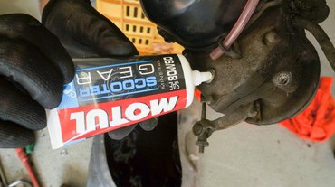 A hajtásolaj lecserélése az időszakos szerviz része, így ezt mi is megejtettük. Hátul, a kerékagy környékén megtaláltuk a váltóolaj nyílását. Mivel leeresztő nincs, így az oldalra borítás módszerével folyattuk a hibátlan kenőanyagot, és töltöttük be a helyére a kevesebb, mint egy deci Motult.