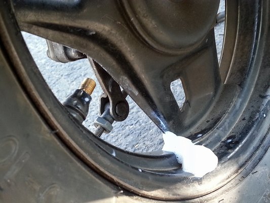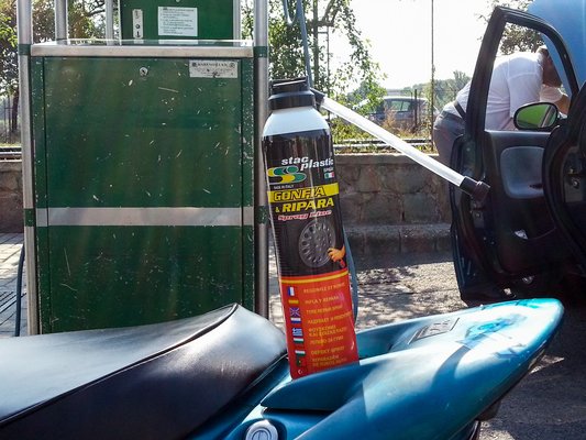 Elméletileg egy tubus egy autógumira elég, motornál a felét ajánlják, robogóra meg senki nem gondolt, de az én olvasatomban a negyed is bőven elég. Ám amikor az ember nyomja a kerékbe a trutyit, miközben a szelepnél és a flakon minden illesztésénél dől a hab - ami empirikus tapasztalataim alapján enyhén maró hatású - hát nagyon nehéz megmondani, belement-e már a gumiba a negyed, vagy már inkább a harmadnál járunk? Én ennek megfelelően keményre fújtam habbal. Egy néni meg is jegyezte, hogy szerinte valami nem stimmel, bár ő inkább a 2005-ös Budapest Parádé habpartiját idéző körítésre gondolt.