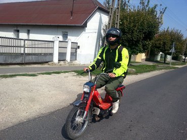 A nap csúcspontját természetesen Ágoston mopedjének kipróbálása jelentette. Amit addig egy nyomorúságos forgalomakadályozó sorscsapásnak gondoltam, arról kiderült, hogy tényleg az, csak ha éppen én ülök rajta, akkor baromi vicces. Olyasmi érzés, mint mérsékelten szétcsapva érkezni valami karótnyelt eseményre, kívülről enyhén kínos, belülről rohadt szórakoztató. Az első pár kilométer masszív rötyögéssel telt, utána pedig a lendület megtartására koncentráltam, ami még falusi forgalomban is olyan feladat, mint szélviharban kezünkkel óvni egy mécses lángját.