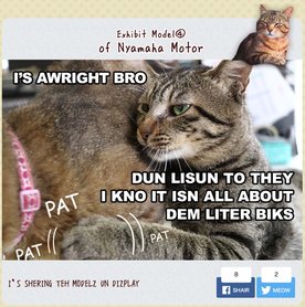 A Yamaha elég egyedi módon kezdi felvezetni a Tokyo Motor Show-ra szánt újdonságait. Egy körülbelül tíz éves mémet poroltak le, és lolmacskákat használnak a felvezető kampányhoz. A lolmacskák - angolul LOL cats - lényege, hogy cuki macskás képekhez általában közepesen vicces mondatokat tesznek, direkt borzasztó helyesírással, hiszen a macska mondja, aki nem tud helyesen írni. Ha valakit mélyen érdekel a téma, akkor itt egy egész jó elemzés, ha pedig a dolog autós vonatkozása tűnne érdekesebbnek, akkor itt egy régi, némileg idevágó Belsőség poszt.