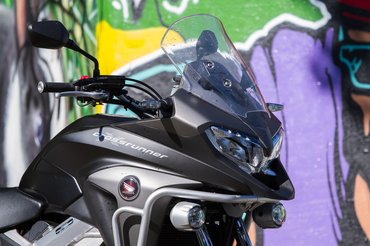 2015-re ebből a háromból egyet megoldottak, a Crossrunner végre néz ki valahogy. Ráadásul nagyon helyesen nem az 1200-as Crosstourer arcát ültették át, hanem a VFR800F-ét, ledobták róla az értelmezhetetlen, burkolt talicskakormányt, amire egy nyomorult GPS-t sem lehetett feleszkábálni, a helyére egy igényes, változó átmérőjű – szaknyelven: kónuszos – kormány került, aminek a kiemelője ugyanúgy gumiágyazású, mint a Versys 650-en de ezen megrángatva nem mozog egy-egy centit minden irányba.