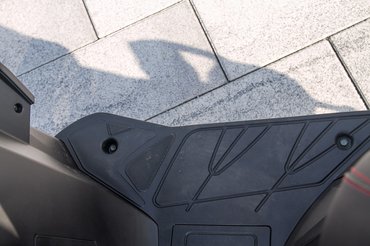 Ennél sokkal súlyosabb probléma, hogy az első pajzs olyan kialakítású, mintha nyáron szoknyában robogózó, nagyon izzadékony személyeknek fejlesztették volna. A menetszelet egyenesen a térdre és a lábak közé vezeti, késő őszi tesztnél ez csak annyira jó érzés, mint amikor a még hideg Balatonban próbálunk strandolni, és befelé sétálásnál lábujjhegyen imádkozunk, nehogy jöjjön még egy hullám. Az ízületeknek nyáron sem tesz jót a menetszél, novemberben pedig egyenesen gyilkos tud lenni.