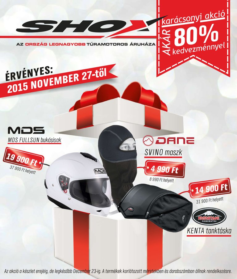 A motorosok sokfélék. Van, aki ilyenkor már rá sem néz a télire elrakott, betakargatott gépre, és van olyan is, akinek csak most kezdődik igazán a móka. Az azonban legtöbbünkben közös, hogy motorkerékpárunknak és saját magunknak is szeretnénk a legjobb cuccokat megadni. Ebben segít ismét a Shox, az ország egyik legnagyobb motoros áruháza. Ahogy már megszokhattuk, karácsonyra ezúttal is combos akciót hirdetnek, egyes termékekért akár nyolcvan százalékkal kell kevesebbet fizetni.