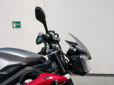 Ez itt, a teszten viszont egy újabb, modernebb Street Triple, ráadásul a spéci R-kivitel, full állítható futóművel, gyorsváltóval (erről többet később), sőt, így az X taggal megtoldva (azaz RX) már a Daytona faridomát és teljes hátsó vázrészét, ezért egyszemélyesnek tűnő ülését is hordja. Kapjatok el, ha esetleg elszédülök.
