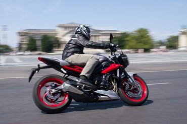 A vicc az, hogy az idomok hiánya ellenére nagy sebességnél sem tép le a szél – pedig ezért vagyok én burkoltmotor-rajongó, vagy legalábbis szeretem, ha van előttem egy bikiniidom –, száznegyvenet úgy lehet vele menni, hogy az még kényelmes, a százhatvan is belefér, és ott még csak kicsit kell gubbasztani. Közben pedig nem egy burkolt túragép kongó vödrének mélyén, hanem egy boldogan zajongó naked motoron ülsz, ami ebben a műfajban ugye, az autós kabriózás, lelkileg meg a beteljesült szerelem megfelelője.