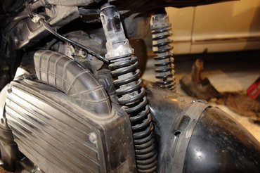 Képzelhetik, micsoda erők munkálkodtak bennem másnap reggel. A rugóstagnál rájöttem, az a baj, hogy míg az autókénál tesznek a szár végére egy nútot, egy négyszöget, valamit, amit meg lehet fogni szerszámmal, itt rövid a szár, nem lóg ki az anyából semmi, tehát nem lehet erőből meghúzni. És bár nagy erő nincs rajta, hiszen alapvetően nem a szár, hanem a rugó támaszt, azért egy-egy erősebb belengésnél szépen rángatja ez is a rögzítést, idővel pedig kicsavarodik és akkor megint átmegy gumievős szörnybe.