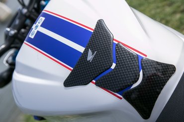 Az idei CB500F nem egészen ugyanaz a motor, amivel szemeztem, bár nem állítanám, hogy azonnal észrevehető a különbség, hiába cserélték le a burkolat nagy részét. Kisebb lett a fejidom, más formájúak lettek a tank oldalán a légterelők, az ülés alatti burkolat is más kialakítású, ahogy a nyereg és az azt övező idomok is újak. A műszaki alapok – a váz, a blokk, a kerekek, a fékek – viszont nem változtak érdemben. Talán ezért tűnik úgy, hogy a gép karaktere szinte érintetlenül megmaradt, vagy talán csak egy egész kicsit lett agresszívebb. Lehet persze, hogy csak a klasszikus vörös-fehér-kék fényezés miatt érzem így – nem hiszem, hogy létezett már Honda, amelynek ne állt volna jól ez az összeállítás, és ez sem kivétel.