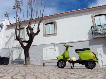A jó kompozícióba parkolást egyébként nem csak Lisszabonban érzik a népek, hanem az onnan fél óra motorozásnyira eső Sesimbrában is, ezt a Vespát nyilván egy festőművész parkolta, izé, komponálta a tér szélére. Még egy olasz járművet sem szokás leállítani ilyen tökéletesen.
