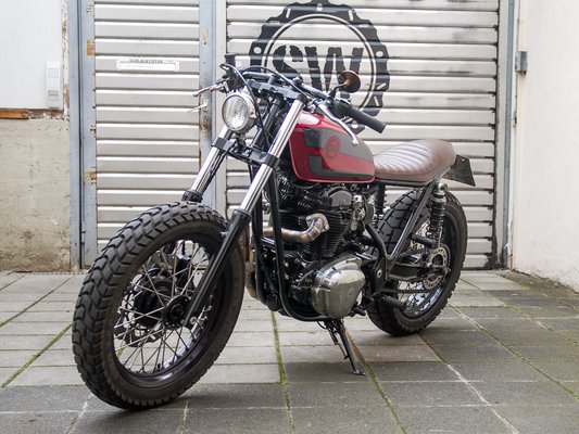 Thomas Thöring egyébként súlyos arc, ő üzemelteti az offenbach-i Schlachtwerk motorépítő műhelyt, aminek a neve is dupla fenekű, a német schlachten ige jelent bölléri értelemben vett levágást is, de autós-motoros vonalon a bontást is így hívják. A műhelyben sorban állnak a projektek, ottjártunkkor éppen a főattrakciónak számító 1983-as TR1 volt a középpontban.