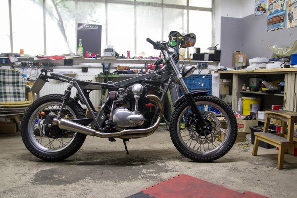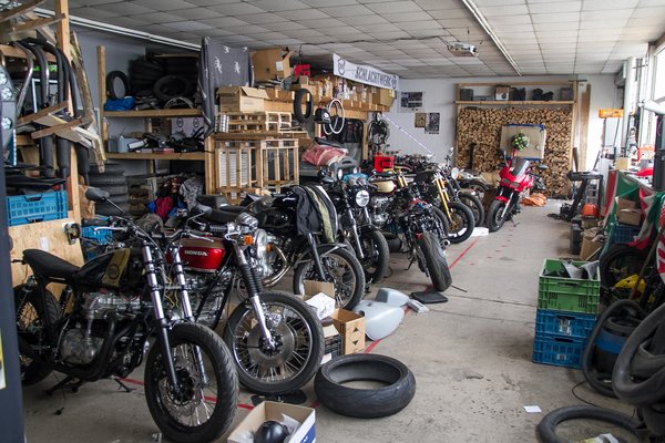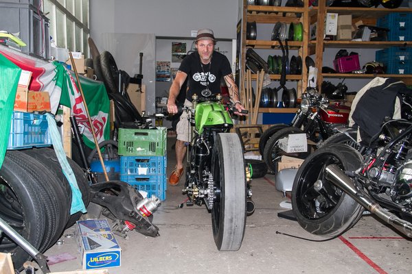 Noha a TR a fő műsorszám, a műhelyben sorakoznak a félkész munkák. A szemem megakad egy GSX-R1100-on, ám mintha a váz nem stimmelne. Thomas legyint, hogy azzal ne is törődjek, mert nehéz és hosszú lesz. A váz eleve egy Z1000-es Kawasakié, ami már a maga idejében sem volt elég merev a 80 lóerős blokkhoz, a 70 lóerővel durvább Suzuki blokkhoz meg pláne nem. Persze javít, hogy a motor eleje egy Ducatié, az egykarú lengővilla pedig egy Triumphról jött, de Thomas a súlycsökkentés elkötelezett rajongója. Ott van például a saját Kawasaki W650-ese – a királytengelyes Kawasaki amúgy is a kedvenc típusa.