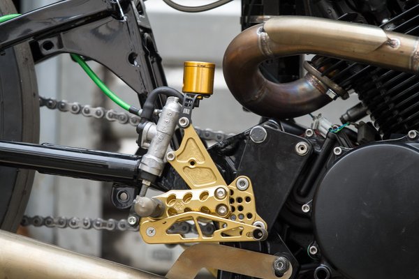 „A blokkot az ügyfél építi, én csak a futóművet, a kipufogót és a külsőségeket rakom hozzá. A kovácsolt alumínium kerekek a PVM-től érkeztek, az első villa Yamaha R6, a kettő az egybe kipufogó viszont az én művem. Padon szoktuk mérni a rendszereinket, a széria 50 lóerőre úgy további 5-6-ot dobnak rá.” – mutogatja a részleteket – „Ez egy nyugis blokk lesz, olyan Buell karakterisztikájú, inkább nyomatékos lesz, mint pörgős.”