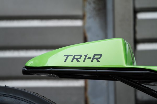 „A váz középső részét kapásból ki szokás venni a TR1-ből, mert így is bírja, a blokk ugyanis teherviselő elem. Ebben most nincs hátsó gátló, de nemsokára lesz benne, mert megyek a Wheels and Waves fesztiválra, ott van egy gyorsulási verseny, amiben van két enyhe kanyar, és ott nem szeretnék szájra esni” - magyarázza Thomas a stratégiát. Míg nem figyelt oda, ránéztem a telefonomon Glemseck 101 honlapjára. Ő és a zöld TR1 volt a fejlécben.